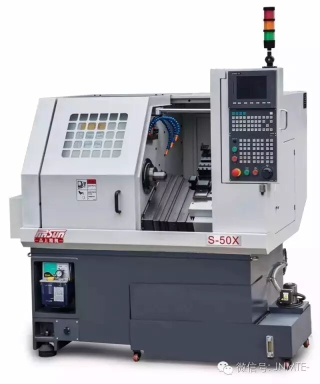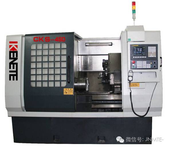 ▲本機(jī)身采用機(jī)電一體化設(shè)計(jì),床身和底腳為整體結(jié)構(gòu),床身向后傾斜45度,結(jié)構(gòu)緊湊,剛性強(qiáng),抗震性好,排屑方便。